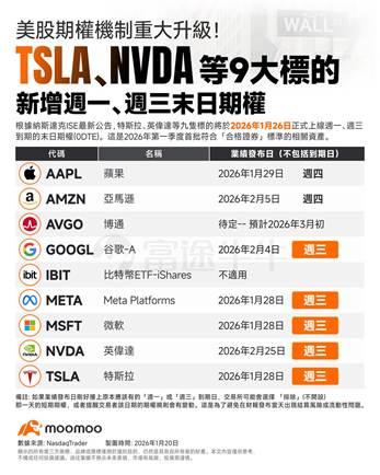⼀、美股期權市場重⼤變⾰ 1. 熱⾨個股新增週⼀、週三「末⽇輪」 1⽉26⽇起,Tesla(特斯拉)、NVIDIA(英偉達)、Apple(蘋果)、Amazon(亞⾺遜)、Meta、Google (⾕歌)、Microsoft(微軟)、Broadcom(博通)以及⽐特幣ETF將新增週⼀及週三到期的期權。這意味著,除原本的週五外,投資者每週將有更多交易短期期權(俗稱「末⽇輪」)的機會。 2. 後續個股新增週⼀/三期權的⼊圍⾨檻 只有被歸類為「合資格證券(QualifyingSecurities)」的標的,才能開啟週⼀和週三的到期⽇。篩選標準每季度重新評估⼀次: 指標 ⾨檻要求 市值 個股:前⼀季度末,市值必須超過7,000億美元。 ETF:資產管理規模(AUM)必須超過500億美元(IBIT因特殊性獲列⼊⾸批)。 成交活躍度 每⽉的期權成交量(單邊計算)必須超過1,000萬張合約。 持倉限制 該證券必須擁有⾄少25萬張合約的持倉限制等級(代表極⾼的市場深度)。 報價規則 必須屬於「PennyIntervalProgram」(即報價增量可以是1美分,⽽⾮5美分或 10美分)。 3. 三個必須注意的交易細節 ◦