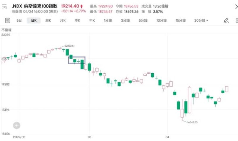 特朗普對中放鴿,美股連漲3天,納指100(NDX)週四(4月24日)漲升521點或2.79%,收在19214;標指升2.03%,納指自週一(4月21日)低位回升逾9%,標指自4月7日股災日的低位彈升逾13.4%。