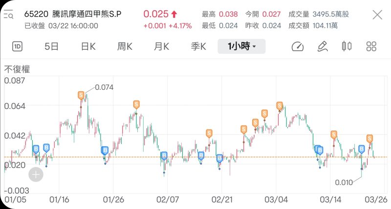 港股方面,這星期多隻焦點股份公佈業績, 最受市場中目的騰訊在業績公佈後的隔天(3月21日) 衝上298.2元最高,之後回落,距離300元只有一步之遙, 仿似魔咒一般,今天又回跌至290元之下的區間裡面, 今年自年初1月份騰訊跌破300元之後, 每次反彈回升皆在290之上止步,始終到不了300元這魔咒, 這次業績後還是再一次上衝失敗而回,傷透了騰訊投資人的心, 自今年一月份開始, 我每次趁騰訊反彈上290元之上去買最貼價的300元收回的熊證 ,並持續至今,連同昨天已經是第6次的來回。