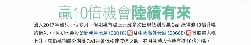 ….繼而在月中過後,0914安徽海螺、3323中建材及2600中鋁等突破頸線位,在3至4天之內走出超逾過去半年的高低幅度,造就價外期權最多15倍以上的升幅,即使分段平倉,也有超過10倍以上利潤。