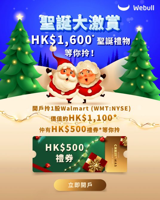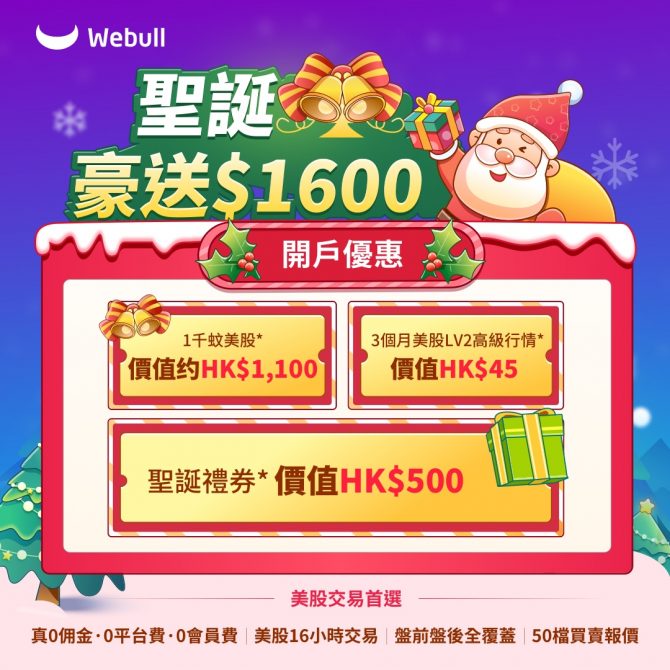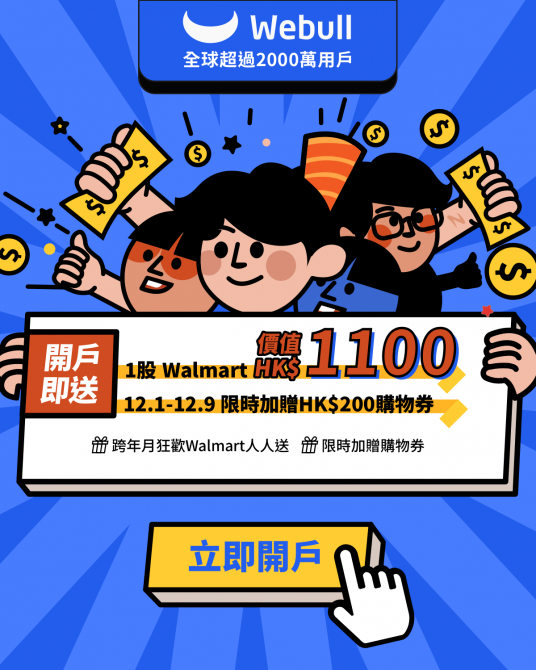 開戶唔單止可以拎到一千蚊免費股票,仲送您聖誕限時加碼獎賞HK$500禮品卡,最重要係美股交易真$0佣,讓您慳得更多! 聖誕限時加碼活動進行中,切勿猶豫,現在立即開戶! 用這個連結開戶 https://a.webull.hk/i/optionsjacky 下載Webull App完成開戶,即可獲得HK$500禮券,於60日內每日維持HK$10,000結餘及買入一筆美股,仲可以拎走1股Walmart 沃爾瑪!!! 千萬用戶信賴 :全球超2000萬用戶 【開多個戶口有備無患】 用這個連結開戶https://a.webull.hk/i/optionsjacky 真0佣金、0平台費、0會員費;美股16小時交易,盤前盤後全覆蓋;50檔買賣報價;13種畫線工具,54個技術指標;1個賬戶跨平台使用;全美16間交易所最佳報價(NBBO)*。 持牌券商保障 :香港證監會持牌法團、受香港投資者賠償基金(“ICF”)保障