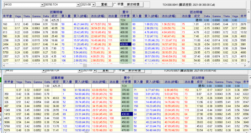 很多人會在業績之前搏騰訊long call或 long put有些甚至long兩邊 (Long strangle),其實自三年多前我多次在網上公開分享過:我絕不會在騰訊業績前做long strangle,或任何long,當股份公布業績前市場已經將引伸波幅炒高時,即使long對方向,利潤也很小,經常會對方向而輸iv回,前天開始騰訊業績後IV急回。 全新網上期權速成~隨報隨學 – Optionsjack 過去基於反散戶方向心態,我還試過幾次業績前做Short strangle (short call +short put) 都有微利,不過這次我沒有做,因嫌業績前iv不夠高,以前也試過做:long calendar spread , 即long遠月short近月同一行使價,例如周一的舜宇光學業績前(2382)。 騰訊業績前引伸波幅已經上升 圖一乃業績前股價432.4元(8月18日收市前)的8月及9月期權及iv價分佈 圖二為8月19日業績後價格在434.4元中午收市前時的期權分佈,業績後的引伸波幅明顯回落,若long 兩邊,不到半天8月輸35%,9月輸15%。 圖三乃8月20日騰訊在424元時,比對業績期權金跌更多,儘管股價跌了一些,put仍跌。 不過無論我講多少次都無用,很多人仍然會幻想用Long來買業績之後的升跌,投資人就是這樣,看過不會記得,上過N次堂也不會記得,要輸個才會記得。 這就是實戰經驗的重要 全新網上期權速成隨報隨學-2025年 更多分享請訂閱: Option Jack:全職交易員的港股部署