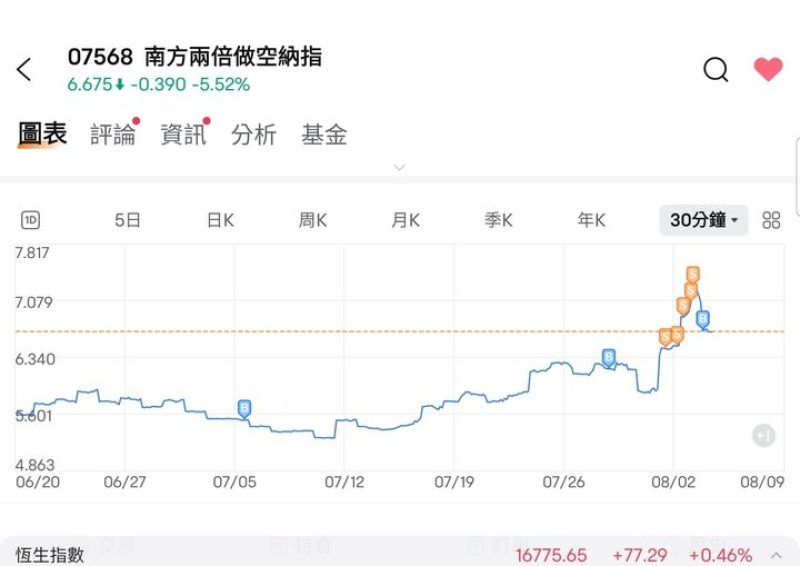 由於市場憂慮美國經濟數據放緩,轉為硬著陸,經濟衰退擔憂迅速蔓延,週一(8月5日)早段日元觸發止蝕盤而急升,引發日股重挫,美股指數期貨急跌,連鎖效應,造成亞太區市場甚至環球股市重創,vix恐慌指數一度升至四年以來新高。 美股從終極一升至逆轉,7月中前納指圖表上出現教科書式的標準轉勢形態,不到四星期時間,美股3大指數已跌回起步漲時的水平。 日經指數最敏感的就是日元匯價的變動,昨天重挫4451點或12%,幾乎收在最低位,此次跌幅超過了1987年10月20日時的紀錄,這次黑色星期一的核心主角其實是日本股市。 納指期貨週一在日本股市收市前跌至最低位,NQ期貨曾下跌1100點,市場一度出現恐慌,而道指期貨(YM)的低位則出現在美股開盤前,最多跌超過1200點,美國股市正式開始後,不斷向上反彈,收窄盤前的大部份跌幅,其實這也是意料中事,因為這次下挫的主角並非美股,我把逆轉以來餘下的美股淡倉趁機全平,雖然淡倉全平,但估計未來反彈震盪幾天之後,美股指數可能會再下跌,不過再出現像週一(8月5日)的恐慌性急挫的機率極低,昨天下午時段納指期貨put 出現極高的引申波幅(iv),昨晚美股指數期貨反彈,iv比對盤前時已大幅下滑,預期未來iv還會漸漸下跌。 至於港股方面,昨天(8月5日)上午恆指不太跌只是震盪上落幾次,但下午受日股及NQ期貨擴大跌幅拖累,下午一開恆指即跌幅擴大至跌500餘點低見16441,是5月20日高位回跌浪以來的波段低位。 美股昨晚收窄跌幅,今天日本股市反彈一半,恆指早段走高,最高至16909,從昨天最低位反彈460點,之後又回跌震盪,在失落週期中港股繼續走著自己獨有的步伐,估計破底後的恆指未來或許又升回17100點附近。