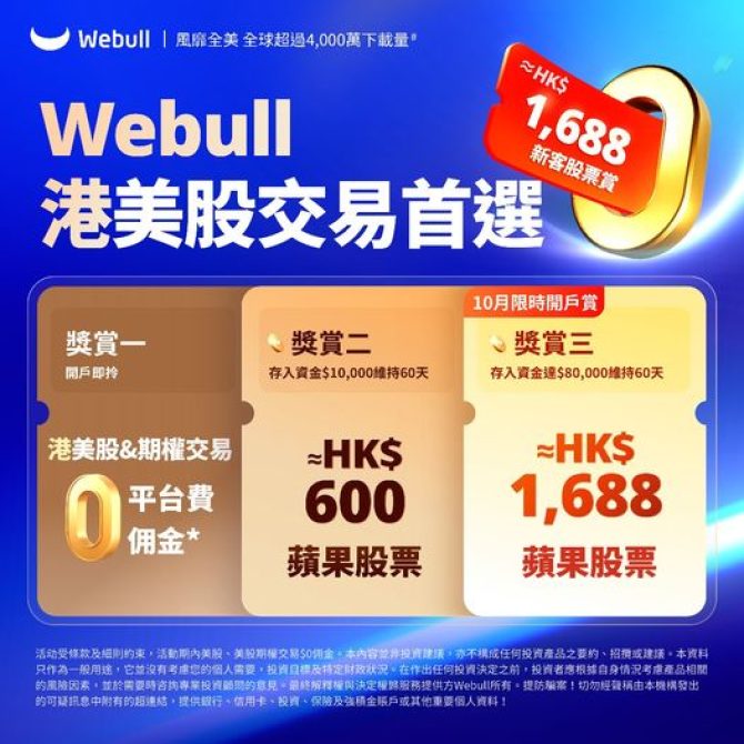 【Webull交易0費用 蘋果股票大放送】 港美股&期權交易,首選Webull! 10月立即開戶,暢享0成本港美股&期權交易,更有快捷落單按鈕,末日期權異動榜單,讓你期權賺錢快人一步。 港美股&期權交易$0平台費$0佣金* 美股24小時及碎股交易,期權異動榜,快速查看異動指數,助力交易。 即刻click我嘅專屬開戶link去攞著數喇:link 在回應 ①一重獎賞:開戶獎賞 開戶即可享港美股免0佣金和0平台費90天 ②二重獎賞:開戶維持HKD80,000資金60天,仲可拎走HK$1688蘋果股票; 開戶後活動期内累计存入HK$10,000+資金維持60天,可拎HK$600蘋果股票; ③三重獎賞:0佣金0平台費期權交易獎賞 活動期間期權交易張數≥50張,即可享0佣金0平台費期權交易