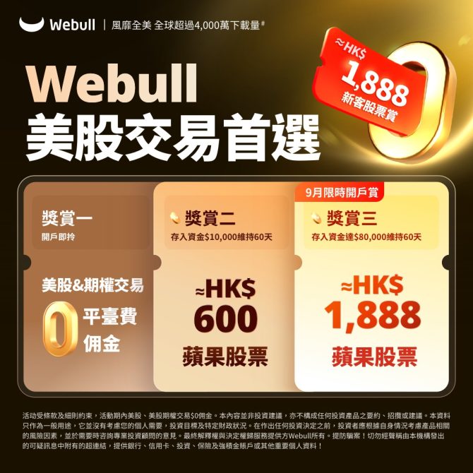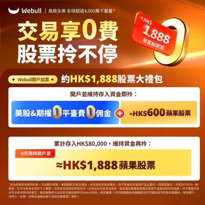 Webull8月獎賞大放送,立即開戶,暢享0成本美股&期權交易,更有快捷落單按鈕,末日期權異動榜單,讓你期權賺錢快人一步。 美股&期權交易,首選Webull! 美股&期權交易$0平台費$0佣金* 美股24小時及碎股交易 期權異動榜,快速查看異動指數。 Webull 8月開戶獎賞,新開戶仲可拎到双重獎賞! 即刻click我嘅專屬開戶link去攞著數喇:https://a.webull.hk/i/optionsjacky ① 一重獎賞:開戶獎賞 開戶即可享美股0佣金0平台費*(優惠截止至2024年12月31日) 開戶+資金維持60天,仲可拎走HK$600蘋果股票; 開戶後累计存入HK$80,000+資金維持60天,可拎走HK$1288蘋果股票; ② 二重獎賞:0佣金0平台費期權交易獎賞 活動期間期權交易張數≥50張,即可享0佣金0平台費期權交易 開戶優惠説明:https://drive.google.com/file/d/1pEYslXcaDF8UVi7NgZaRw0abemMhd8Fz/view?usp=drive_link 超詳細Webull註冊-開戶指引:https://act.webull.hk/contentEdit/index.html?pageId=24443 【Webull優勢】 $0佣金交易* 美股、期權交易$0佣金;港股一律$0佣金、現金新股認購$0手續費;共同基金申贖$0費用;部分美股賣空借貨$0成本。 港美元閒置資金有出「息」微牛現金智投 自動申贖、靈活運用、透過閒置現金賺取被動收入;現金賬戶、融資賬戶均可開通;計入統一購買力,靈活用於交易、提取資金、換匯。 立足美國放眼全球 全球超過4,000萬下載量#;風靡全美,屢獲殊榮;Nasdaq、CBOE及NYSE全球合作夥伴;NBA球隊Brooklyn Nets官方合作夥伴。 一站式投資 多元化產品 一個賬戶打通港美A股;「5×24」小時全天自由買賣美股;Lv2 50檔美股報價,OPRA期權即時報價。