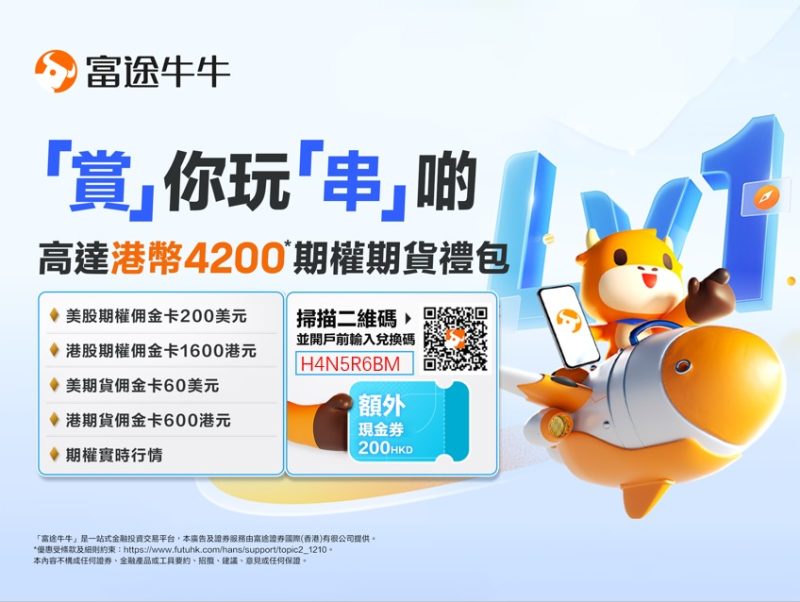 開戶4選1 + 送加碼獎 一重賞(四選一): 二重賞(二選一): 加碼獎輸入兌換碼【H4N5R6BM】可獲額外$200 現金券換領方法:
