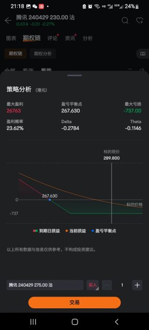 還有很多期權初學者最常用嘅工具就係期權策略分析,下單前都可以睇一睇呢啲圖表,可以睇到你選擇嘅策略嘅盈虧平衡點、最大盈利同埋最大虧損、盈利虧損概率等等,可做到心中有數。